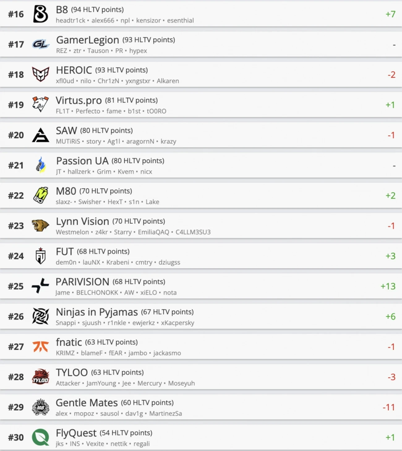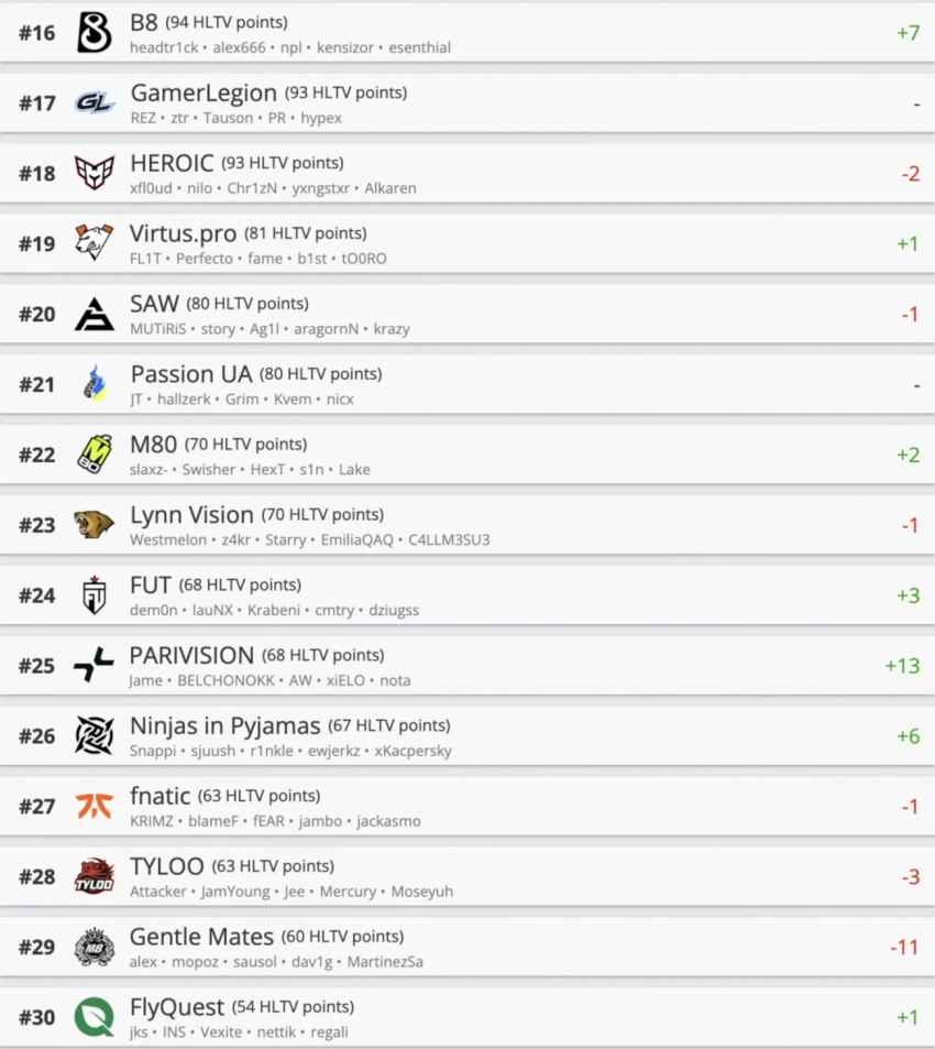 В верхней части таблицы тоже неспокойно: Natus Vincere поднялась на седьмую строчку, сместив конкурентов после выхода в третью стадию мейджора. А вот G2 Esports и Aurora сдали позиции, опустившись на восьмое и девятое места соответственно. Также свои дела поправила FaZe Clan, которая обошла французов из 3DMAX и заняла 12-е место.