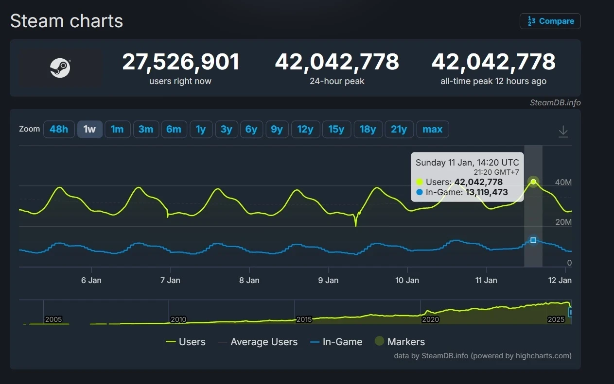 Ранее в этом месяце рекорд посещаемости Steam впервые превысил 41,8 млн человек. Это произошло как раз перед завершением масштабной Зимней распродажи.