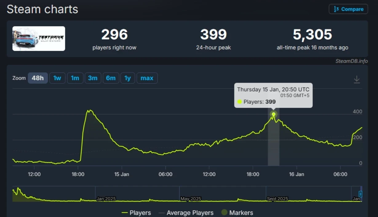 В громкие высказывания о «мёртвой игре» легко поверить с учётом онлайна Test Drive Unlimited Solar Crown в Steam. В обычные дни на пике за сутки набирается несколько десятков человек. Старт бесплатных выходных сумел привлечь аж 399 игроков 15 января — потенциально это число вырастит с приближением субботы и воскресенья. Сами разработчики же призывали не судить об успехах игры по её онлайну.