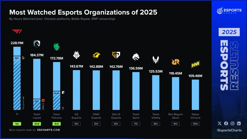 Главные новости » Эксклюзив » T1 по LoL возглавила рейтинг самого популярного киберспортивного клуба 2025 года