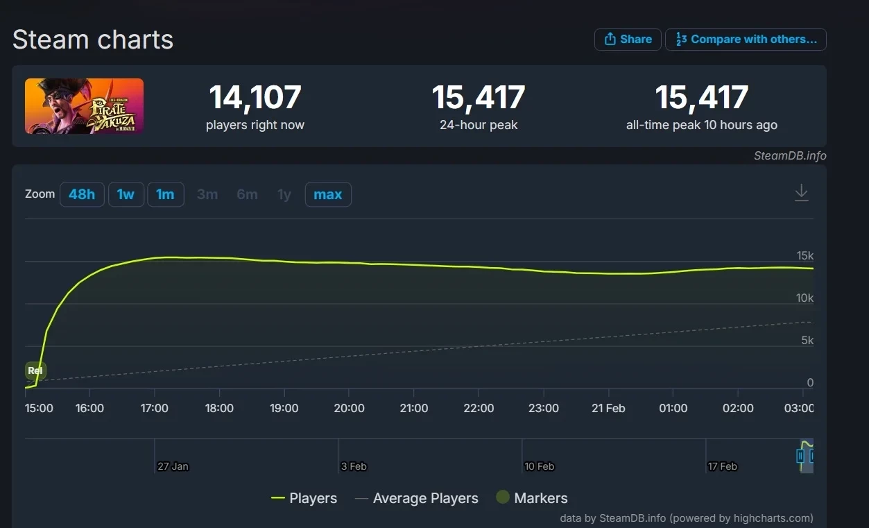 В Steam она привлекла 15 417 игроков одновременно — меньше пикового онлайна Like a Dragon: Infinite Wealth (46 161 игроков), но больше Like a Dragon Gaiden: The Man Who Erased His Name (13 737 игроков).