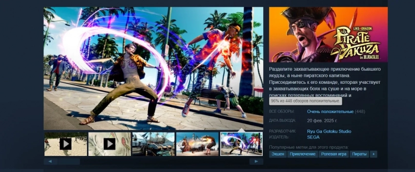 Пользовательский рейтинг Like a Dragon: Pirate Yakuza in Hawaii в Steam — очень положительный, на основе 448 обзоров.