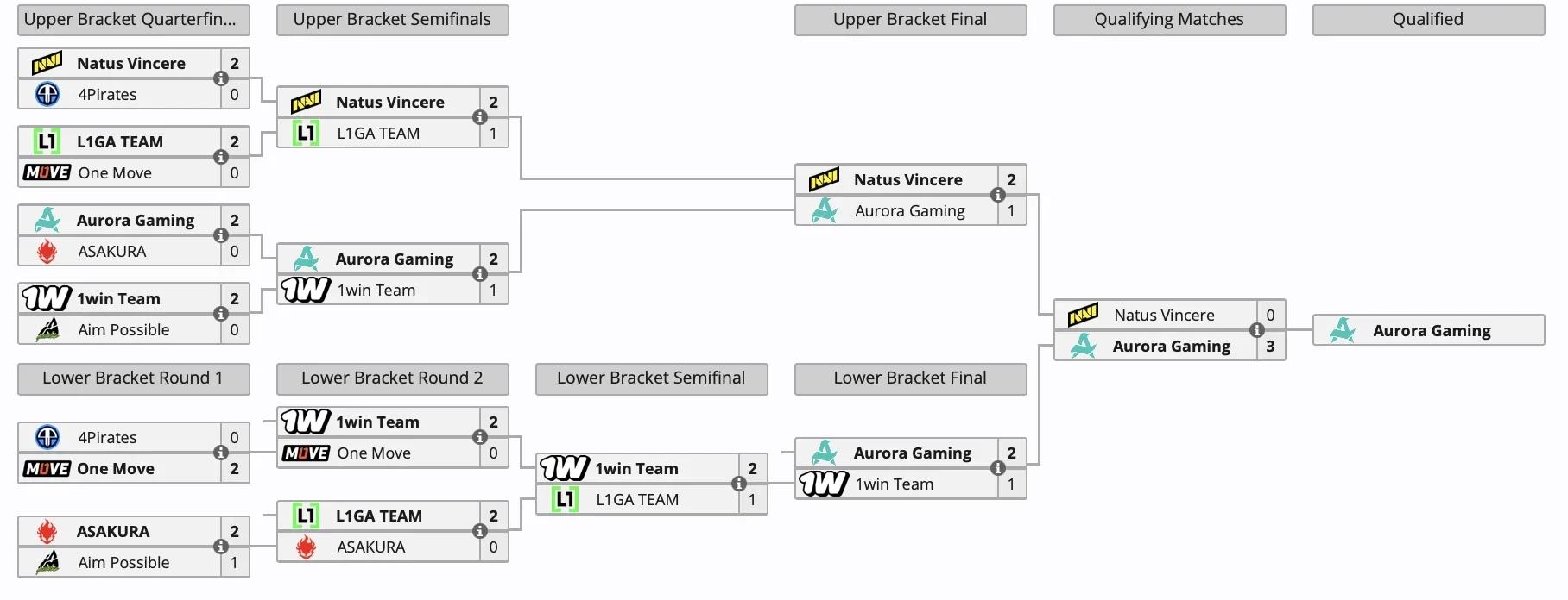 В финале верхней сетки Aurora Gaming сразилась с Natus Vincere и одолела соперников со счетом 2:1. Затем в финале команда повторила свой триумф уже с сухим счетом 3:0. Победа принесла команде первое место и единственный слот для участия в основной стадии турнира.