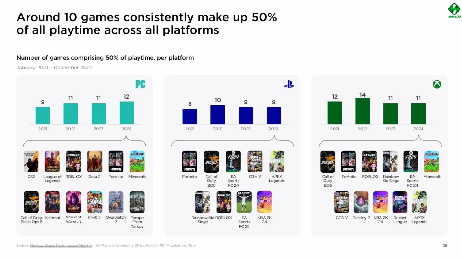 С января 2021 года по декабрь 2024 года около половины всего игрового времени на всех платформах занимал десяток игр, среди которых — Fortnite, Roblox, Minecraft, GTA 5, Apex Legends и Call of Duty.
