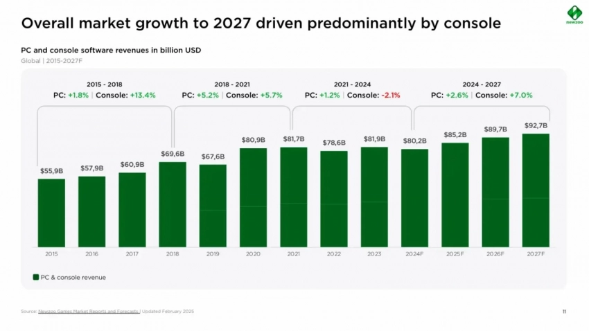• По оценкам аналитиков, с 2024 по 2027 год рынок PC вырастет на 2,6%, а консольный рынок ждёт подъём на 7%.