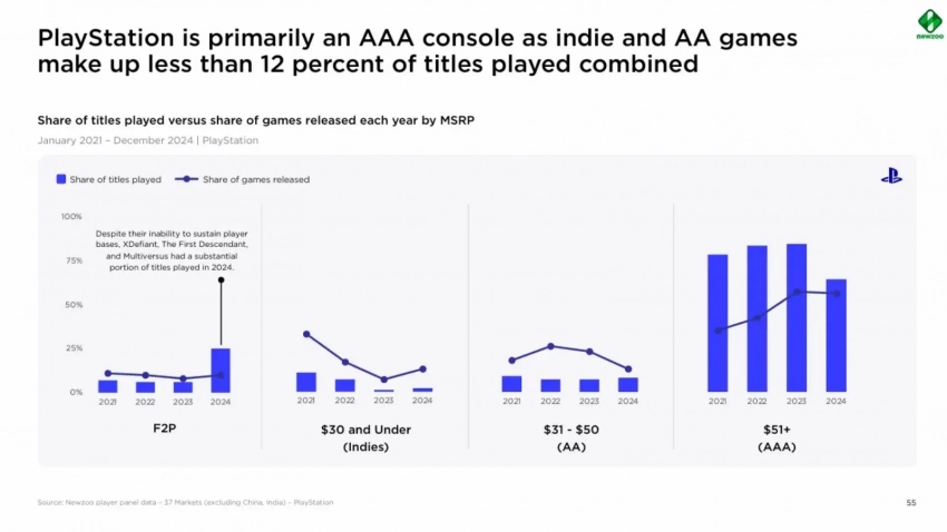 • На PlayStation доминируют крупные высокобюджетные релизы, а низкобюджетные и инди-игры занимают менее 12%.