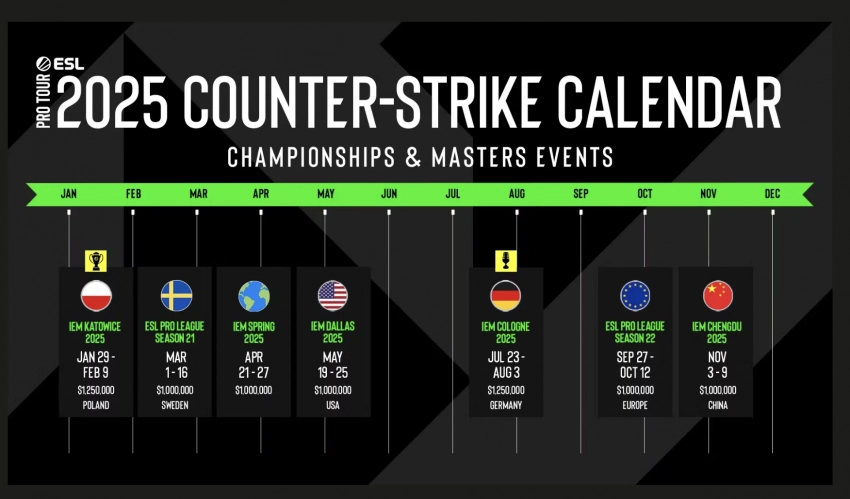 ESL Pro Tour 2025 начнется с IEM Katowice в марте, а затем состоятся мероприятия в Кельне, Далласе и Чэнду. Первый сезон ESL Pro League в 2025 году пройдет в Стокгольме с 1 по 16 марта. В турнире примут участие 24 команды, и будет внедрена новая система сеяния команд.
