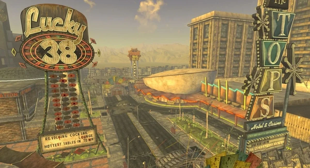 Игроки Fallout: New Vegas легко узнают на фотографиях казино «Лаки 38», принадлежащее мистеру Хаусу — неприступную крепость, которая устояла даже во время ядерной атаки. Другая знаменитая локация — «Топс», открытое для посетителей казино с театром, которым заправляет Бенни.