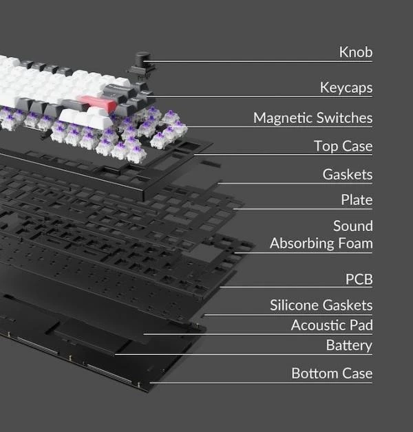В составе Keychron Q1 HE используются переключатели Gateron 2.0 Hall Effect Magnetic Switch. По сравнению с традиционными механическими переключателями уникальная особенность переключателей с эффектом Холла состоит в том, что они способны различать разные степени нажатий от лёгкого до полного.