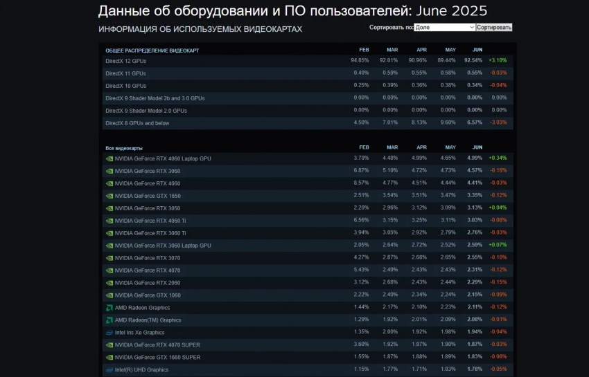 Причём самой популярной видеокартой стала GeForce RTX 4060 для ноутбуков — с ней играет 4,79% пользователей, причём за месяц это число выросло на 0,33%. Следом идут RTX 3060 и стандартная RTX 4060, которыми также обладают более 4% геймеров в Steam. Если говорить про оперативную память, то наибольшей популярностью пользуется золотая середина — 16 ГБ (более 43%). А наибольший рост за месяц показали сборки PC с 32 ГБ оперативной памяти — их число выросло на 0,62% вплоть до 34,37%.