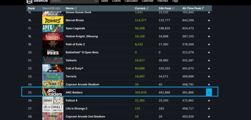 Последняя также уступила ARC Raiders по суточному онлайну (на момент написания чуть больше 100 тыс), несмотря на свежий релиз новой части серии, Call of Duty: Black Ops 7.