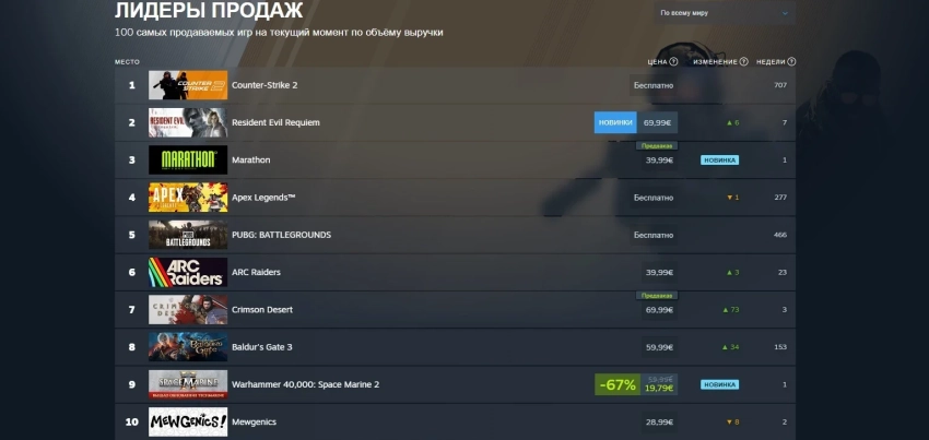 Обложка: скриншот игры MarathonЗавершившийся стресс-тест Marathon, похоже, побудил многих игроков к покупке шутера. Как результат, грядущая новинка попала в мировой топ-3 продаж в Steam, уступив только Counter-Strike 2 (1-е место) и Resident Evil Requiem (2-е место).