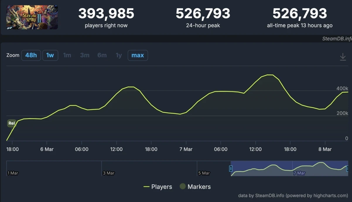 Для сравнения, первая часть — Slay the Spire — во время своего пика в 2019 году достигла примерно 57 тысяч одновременных игроков. Пока сиквел уже собирает более полумиллиона пользователей, оригинальная игра в те же дни показывает около 36 тысяч игроков.