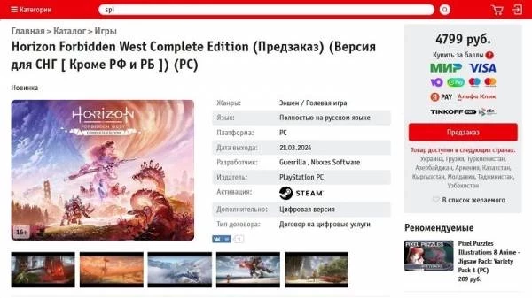 Торговые площадки уже сделали соответствующие пометки в описании товаров. Steam-версию Horizon Forbidden West, продающуюся у «Буки» за 4799 рублей, можно активировать в странах СНГ, не считая РФ и РБ.